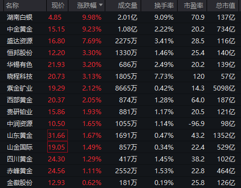 贵金属概念股震荡拉升,湖南白银实现2连板,中金黄金、盛达资源、恒邦股份等跟涨。