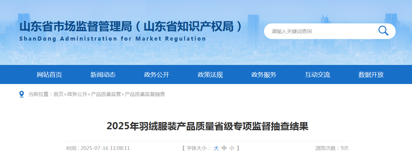 中国质量新闻网讯 近日,山东省市场监督管理局公布2025年羽绒服装产品质量省级专项监督抽查结果。本次共抽查羽绒服装产品15批次,其中,生产环节5批次,销售环节4批次,网售环节6批次。