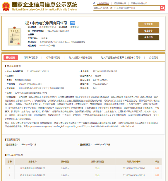 国家企业信用信息公示系统显示,浙江中南建设集团有限公司成立于1984年,注册资本210600万元人民币,法定代表人为吴建荣,公司大股东为浙江中南控股集团有限公司。