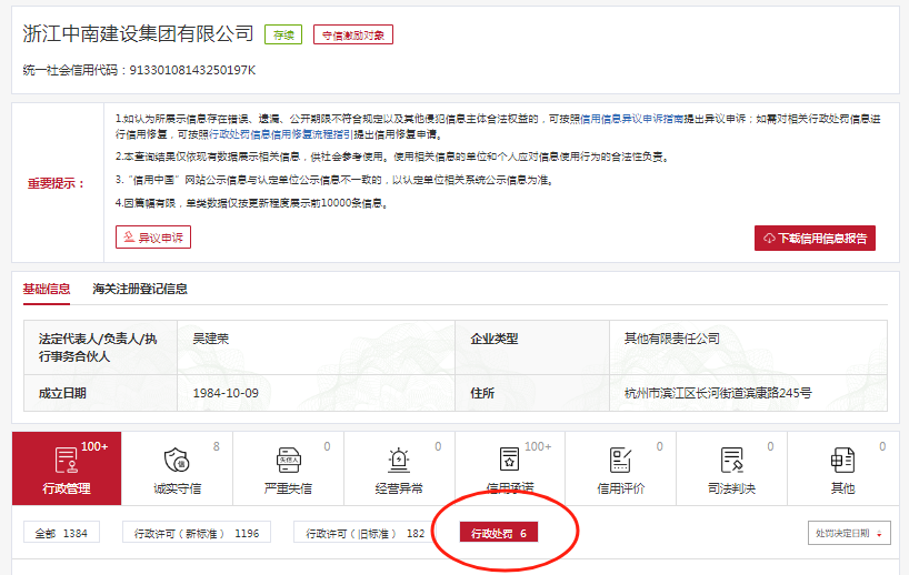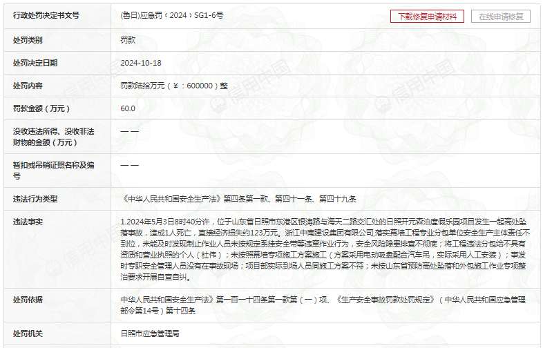 此外,记者在信用中国查询到,浙江中南集团曾多次被罚。例如,在2024年10月18日,浙江中南集团被日照市应急管理局罚款60万元。决定书文号(鲁日)应急罚﹝2024﹞SG1-6号。