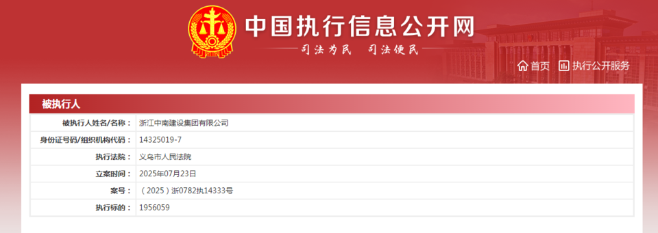 值得注意的是,齐鲁晚报·齐鲁壹点记者在中国执行信息公开网了解到,同样在7月23日,浙江中南集团新增一条被执行信息,其被义乌市人民法院执行标的1956059元,案号(2025)浙0782执14333号。