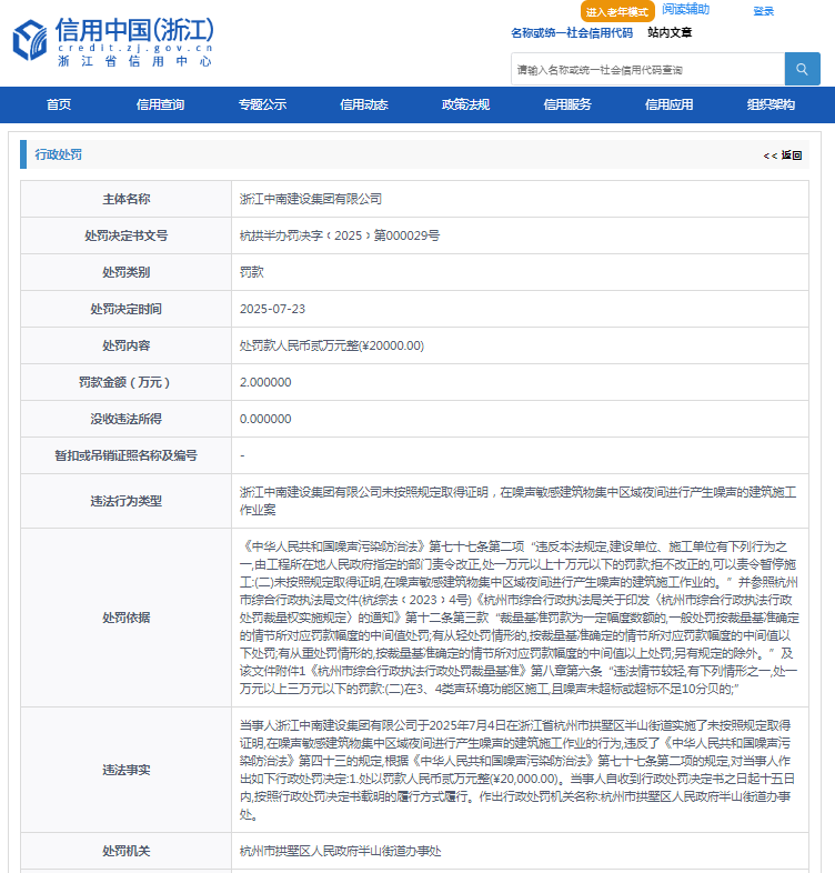 齐鲁晚报·齐鲁壹点记者于信用中国(浙江)行政处罚公示栏获悉,7月23日,浙江中南建设集团有限公司(下称“浙江中南集团”)收行政处罚决定书,违法行为类型是“未按照规定取得证明,在噪声敏感建筑物集中区域夜间进行产生噪声的建筑施工作业”,决定书文号是杭拱半办罚决字﹝2025﹞第000029号。