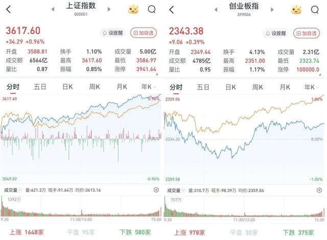 至收盘,上证综指涨0.96%,报3617.6点;科创50指数涨0.4%,报1053.65点;深证成指涨0.59%,报11106.96点;创业板指涨0.39%,报2343.38点。