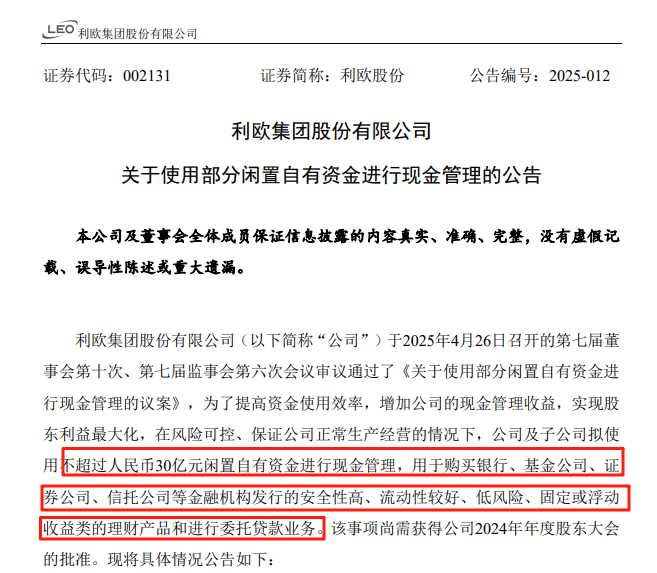 4月29日,利欧股份公告称,公司及子公司拟使用不超过30亿元闲置自有资金进行现金管理,用于购买银行、基金公司、证券公司、信托公司等金融机构发行的安全性高、流动性较好、低风险、固定或浮动收益类的理财产品和进行委托贷款业务。