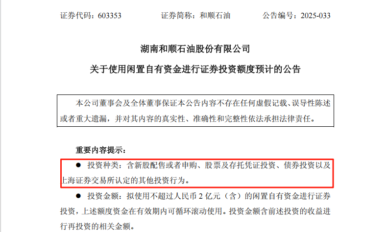 同一天,和顺石油董事会审议通过议案称,公司及子公司拟使用不超过2亿元(含)闲置自有资金进行证券投资,投资期限自董事会审议通过议案之日起12个月内有效。