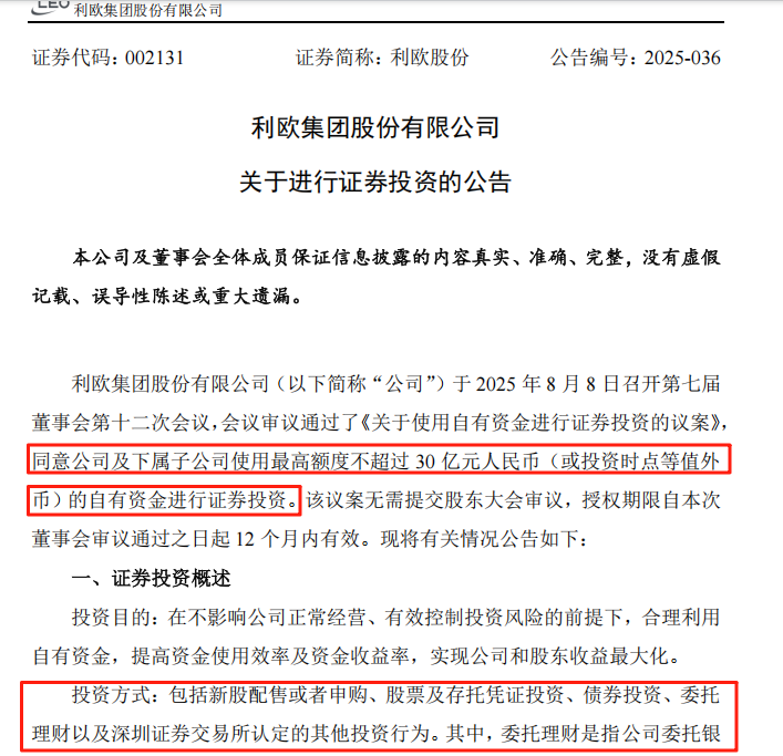 8月8日,利欧股份董事会审议通过议案称,同意公司及下属子公司使用不超过30亿元(或投资时点等值外币)自有资金进行证券投资,授权期限自本次董事会审议通过议案之日起12个月内有效。