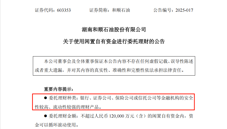 4月26日,和顺石油公告称,公司拟使用不超过12亿元(含)自有资金进行委托理财,委托理财的种类包含银行、证券公司、保险公司或信托公司等金融机构的安全性较高、流动性较强的理财产品。