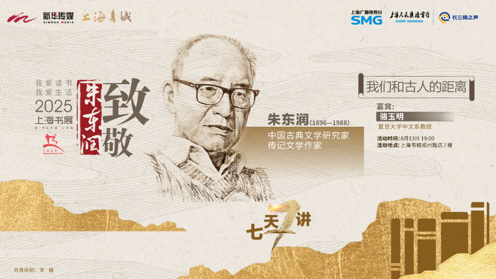 上海新华传媒联合上海人民广播电台长三角之声联合推出“致敬社科大师”主题展及“七天七讲”活动,邀请学者嘉宾及大师后人,聚焦徐森玉、朱东润、王蘧常、熊佛西、胡焕庸、冯契、陈从周等七位上海文化大师学者的生平及文化遗产。8月13日19:00第一场活动,复旦大学中文系教授骆玉明将来到现场,讲述其师长、中国古典文学研究家朱东润的故事。