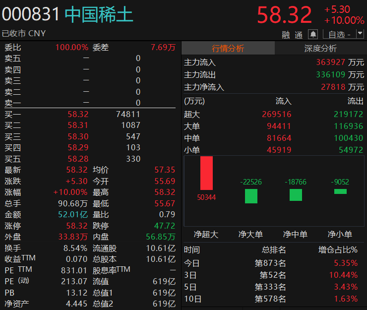 受市场价格、行业政策、业绩预期等多重利好因素催化,近期A股稀土永磁板块行情持续火热。中国稀土今日开盘后直线涨停,实现两连板,报收58.32元,成交额52.01亿元,换手率8.54%。