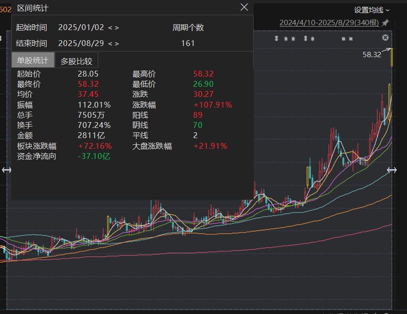 今年以来,中国稀土股价表现亮眼。从年初的28.05元/股上涨至58.32元/股,涨幅达107.91%。截至29日收盘,中国稀土总市值619亿元。