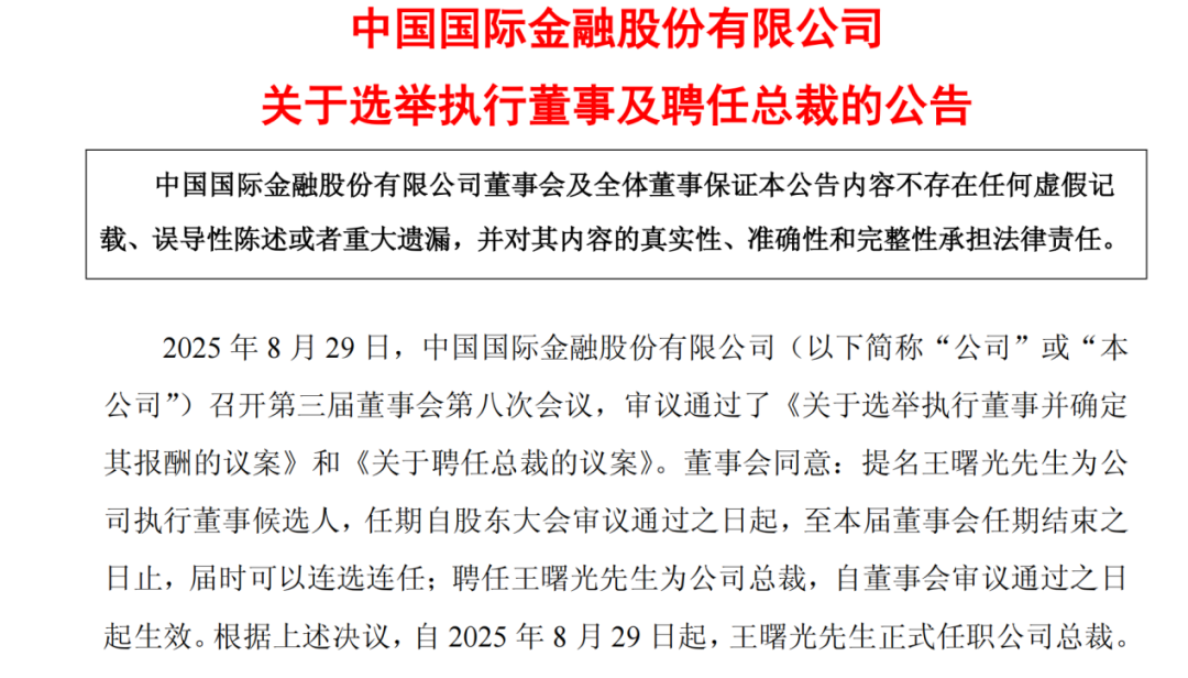 8月29日,中金公司公告称,在今天举行的第三届董事会第八次会议上,董事会同意聘任王曙光为公司总裁。