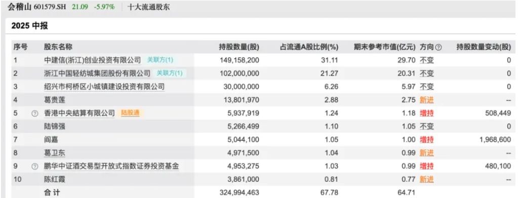 半年报显示,二季度末,葛卫东以个人名义现身会稽山的股东名单,持有497.15万股,期末参考市值为9900万元,为第八大流通股东;同时葛贵莲也成为新晋前十大流通股东,位列第四名,持有1380.20万股,期末参考市值为2.75亿元。两人合计持股市值为3.74亿元。