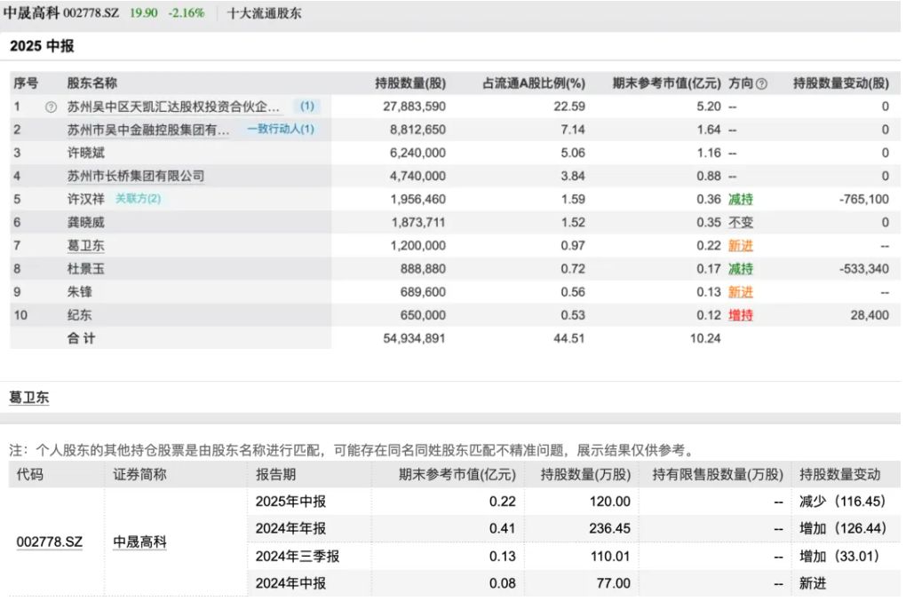 葛卫东今年二季度末再度现身中晟高科的前十大流通股东名单,持有120万股,期末参考市值仅为2200万元。事实上,葛卫东去年二季度末就买进了中晟高科,此后多个季度逐步加仓,但今年一季度末短暂退出了股东名单。
