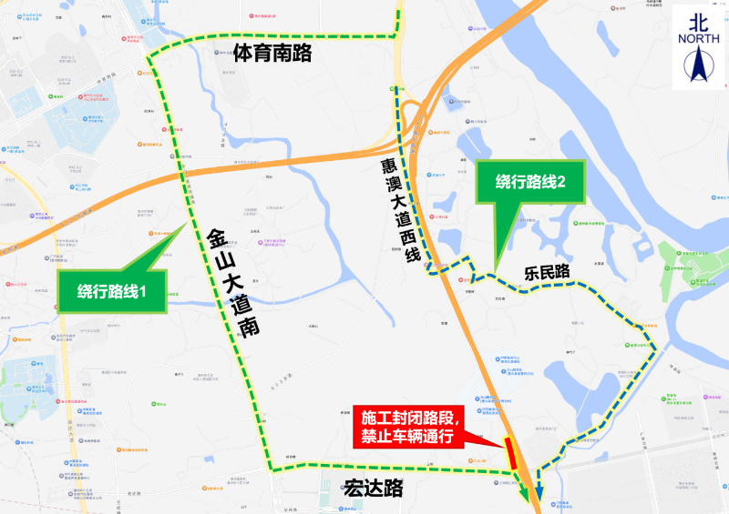 (一)绕行路线1(大货车或小型客车):惠澳大道→体育南路→金山大道南段→宏达路→惠澳大道。