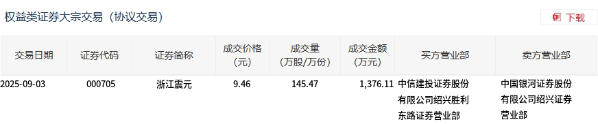 9月3日,浙江震元大宗交易成交145.47万股,成交额1376.11万元,占当日总成交额的6.59%,成交价9.46元,较市场收盘价9.28元溢价1.94%。