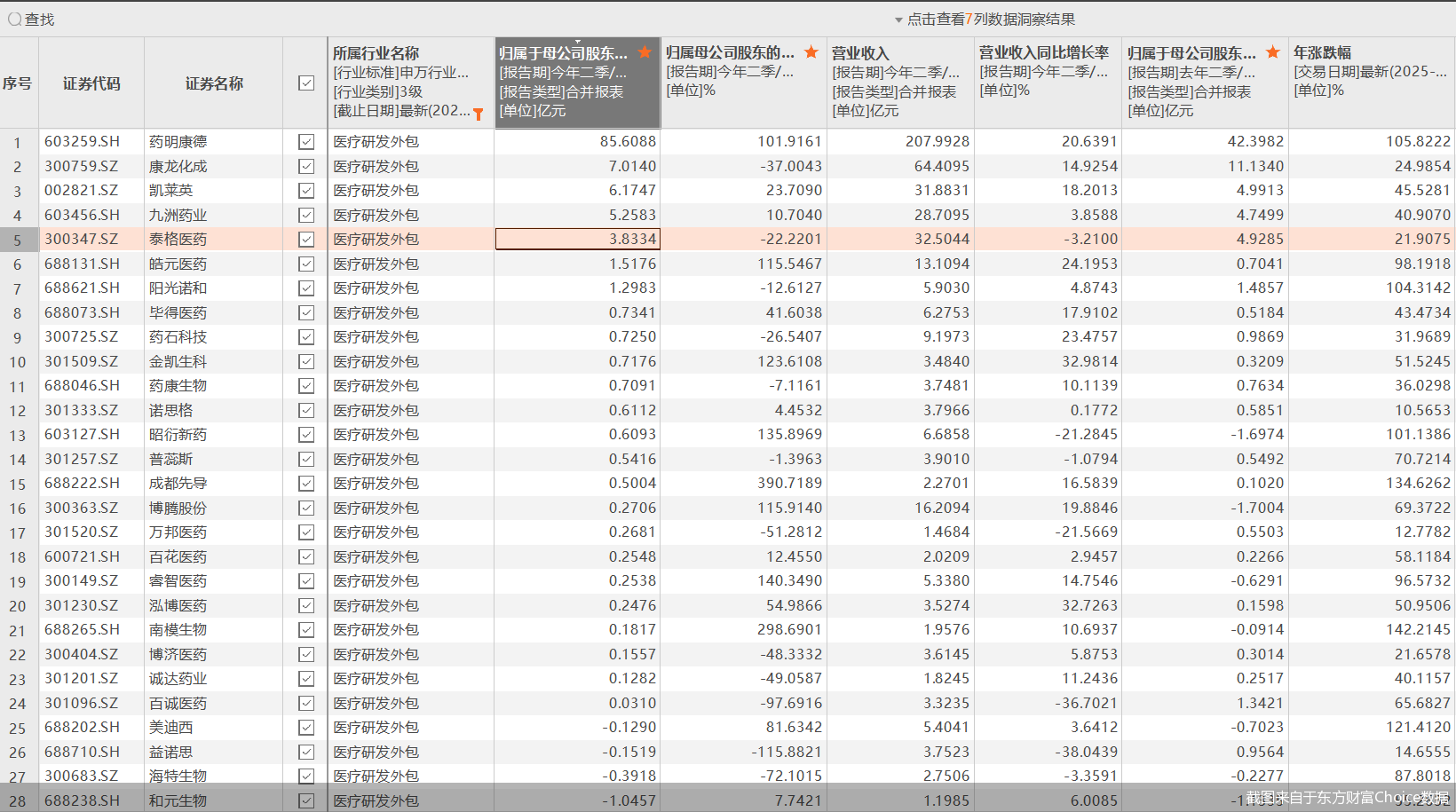 净利排在第三名的是凯莱英,财务数据显示,今年上半年,凯莱英实现的营业收入约为31.88亿元,同比增长18.2%;归属净利润约为6.17亿元,同比增长23.71%。