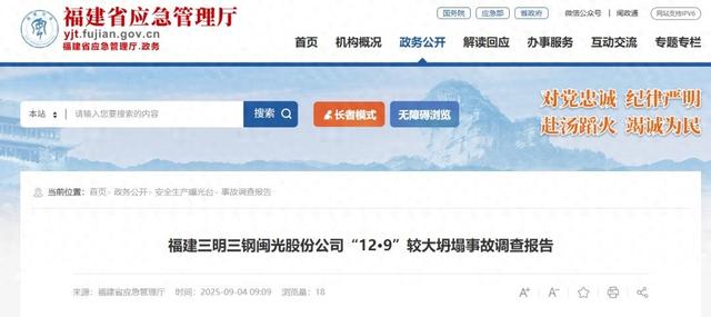 9月4日,福建省应急厅发布福建三明三钢闽光股份公司“12·9”较大坍塌事故调查报告。