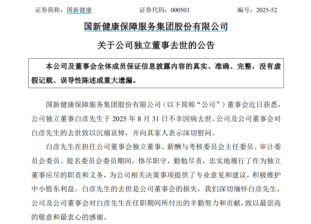 9月4日,国新健康发布公告称,公司独立董事白彦于2025年8月31日不幸因病去世。白彦生前担任公司董事会独立董事、薪酬与考核委员会主任委员、审计委员会委员、提名委员会委员。