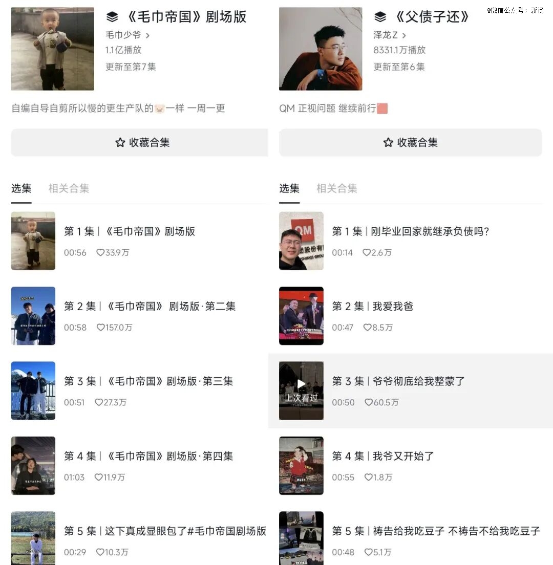 曲美家居二代“泽龙Z”就用“毛巾少爷”同款BGM拍摄了曲美家居的短剧版家族故事,只不过与“毛巾少爷”的主线任务是与二叔争家产不同,“泽龙Z”的主线任务是“负债48亿元,父债子还”。截至发稿前,“泽龙Z”的“父债子还”系列视频累计在抖音收获8331万播放。