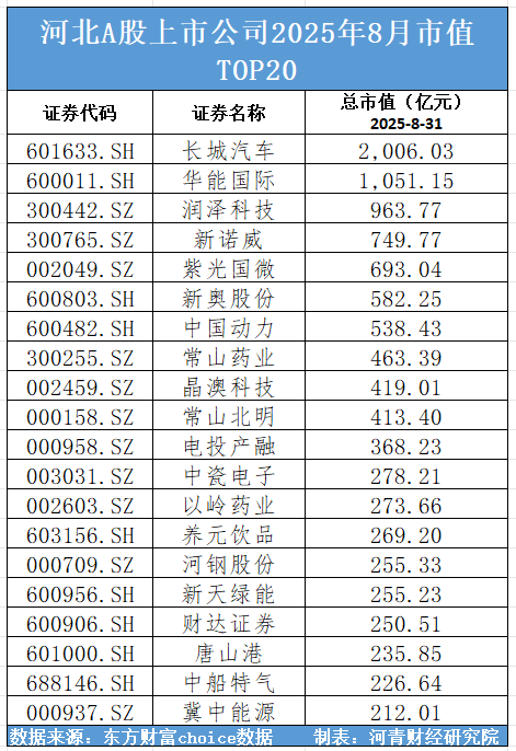 据河青财经研究院统计,河北A股上市公司2025年8月市值排行榜TOP20如下:长城汽车、华能国际、润泽科技、新诺威、紫光国微、新奥股份、中国动力、常山药业、晶澳科技、常山北明、电投产融、中瓷电子、以岭药业、养元饮品、河钢股份、新天绿能、财达证券、唐山港、中船特气、冀中能源(维权)。
