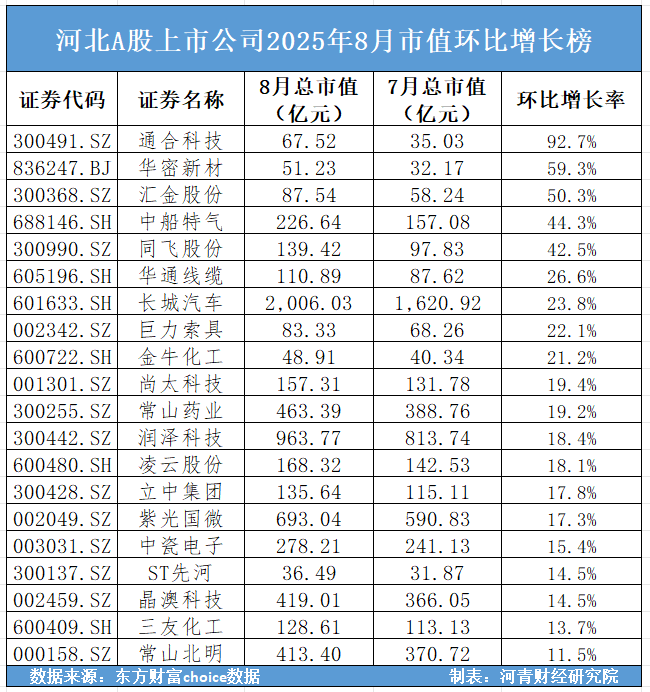 8月,83家河北A股上市公司中,通合科技市值为67.52亿元,较7月增加32.48亿元,环比增长92.72%,位于环比增长率排名第一位。