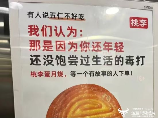 在桃李面包投放的五仁口味蛋月烧广告中,广告文案为“有人说五仁不好吃,我们认为:那是因为你还年轻,还没饱尝过生活的毒打”。