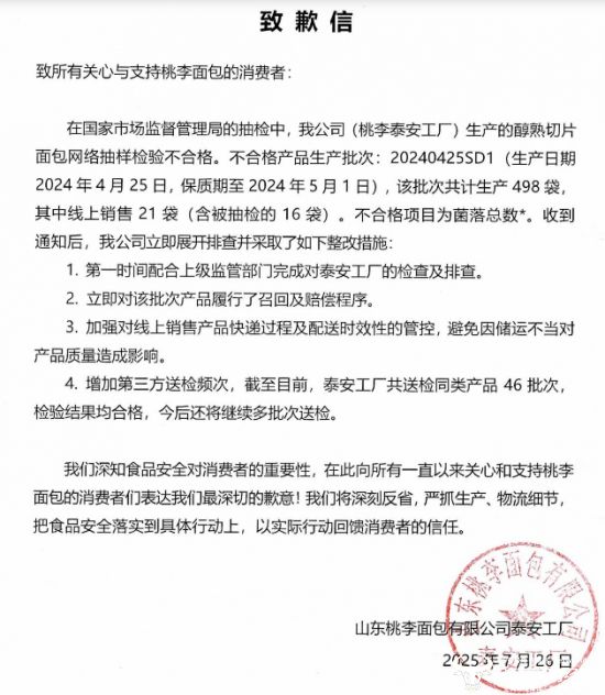 而此前桃李面包刚因产品抽检不合格致歉。今年7月,市场监管总局公布食品抽检情况通告,其中1批次北京市桃李食品有限公司委托山东桃李面包有限公司生产的醇熟切片面包,被抽检出菌落总数超标,随后桃李面包发布《致歉信》。