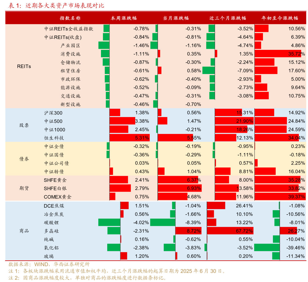 大类资产角度,当前REITs极易受到股债市场影响,当市场风险偏好加强时,偏红利概念的REITs表现往往偏弱。本周权益市场和金银涨幅领先,恒生科技涨幅达5.31%,沪金、沪银分别上涨2.41%、2.79%,REITs全线飘绿。国内商品市场涨跌分化,碳酸锂跌幅最大达4.02%。