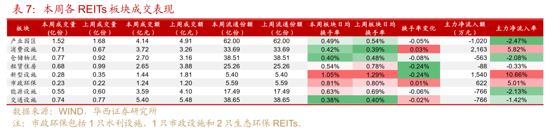 分板块来看,日均换手率靠前的是新型设施(1.05%)、市政环保(0.81%)和能源设施(0.63%),靠后的是交通设施(0.38%)和仓储物流(0.40%)。本周消费设施和市政环保日均换手率环比各增加了0.03pct和0.01pct。从主力资金流向来看,主力净流入率靠前的板块是新型设施、消费设施和市政环保,靠后的板块是产业园区和能源设施。新型设施2只REITs本周有所回调,主力资金的流入值得关注。