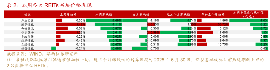 本周REITs仅12只上涨,61只收跌。产业园区板块跌幅最大达1.46%,且所有个券全部收绿,跌幅靠前的是南京建邺(-5.19%,7连跌)、合肥高新(-4.57%,4连跌)和津开产园(-3.90%,4连跌后回升但再次下跌),2025年6月末出租率分别为70.67%、74.81%和87.54%,预测分派率分别为4.26%、5.36%和4.48%,可优先关注3只REITs的反弹情况,其中南京建邺、津开产园设有收益分配调节机制。