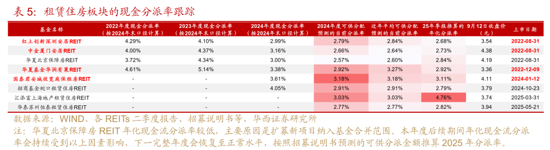从现金分派率角度看,产权类项目分派率较高的分别是产业园区(4.36%)、消费设施(4.22%)和仓储物流(4.07%),租赁住房板块现金分派率约3.08%。华夏北京保障房REIT扩募后预测现金分派率将提升至2.84%左右,可继续关注扩募能提升分派率的保租房项目。
