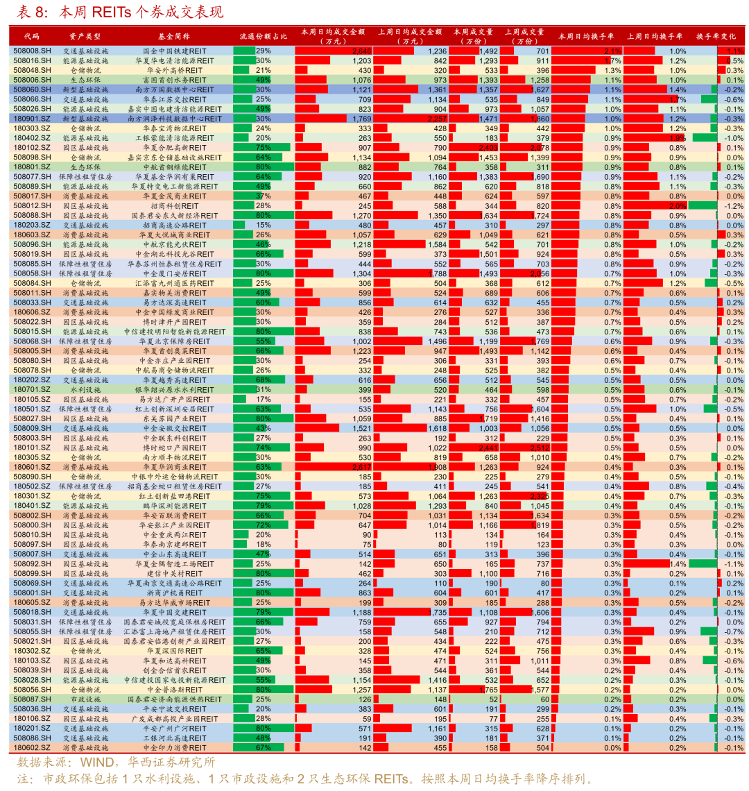 REITs成交情绪仍不高,日均成交额4.98亿元、日均成交量1.09亿份、日均换手率0.48%,环比均有下降。