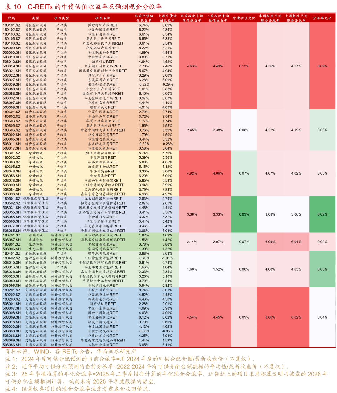 本周REITs全线下跌略微提升了个券收益率和分派率。从中债估值收益率来看,本周园区板块变化幅度最大,整体上涨了0.15pct至4.63%。仓储物流(4.92%)和交通设施(4.54%)估值收益率靠前,板块内个券数量较多、估值分化较明显,优先选择设置了业绩兜底条款、出租率/车流表现尚可的经济发达区域项目。