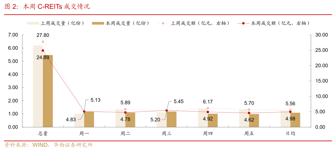 本周REITs成交活跃度仍走弱,日均成交额4.98亿元、日均成交量1.09亿份、日均换手率0.48%(不含新上项目),环比分别下降10.44%、11.62%、0.06pct。