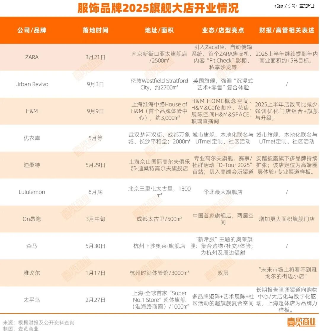 壹览商业统计快时尚品牌、国际运动品牌、国内女装/大众服饰的典型样本发现,除了开头提到的H&M,开旗舰店已经成了服饰品牌的一致动作。