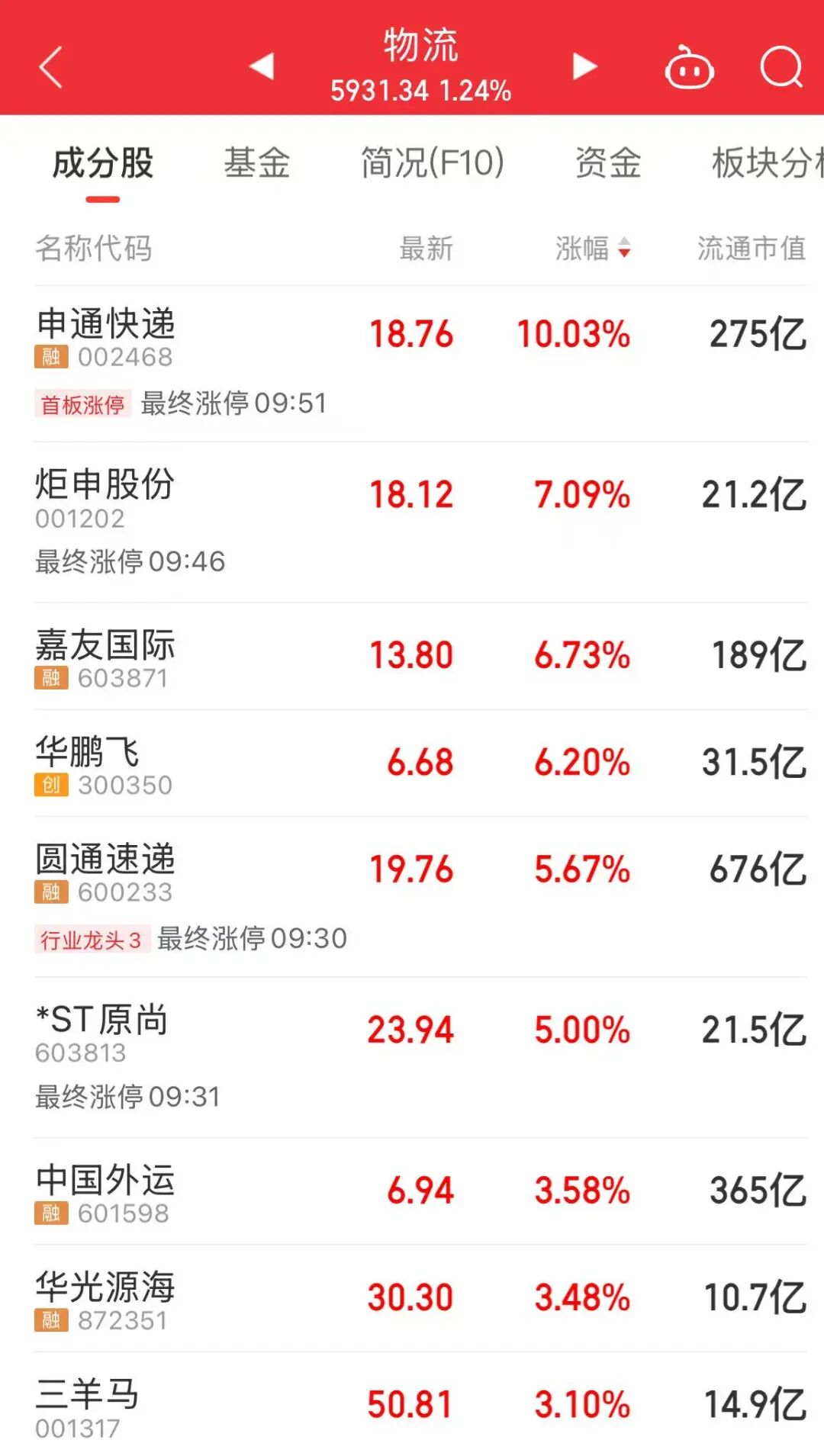 今天上午,物流板块上涨,龙头股申通快递早上开盘秒涨停,华鹏飞(维权)、圆通速递等个股也大涨。