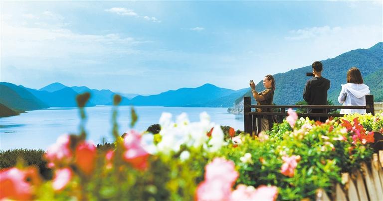 9月10日,游客在白山市浑江区国家AAA级景区龙山湖景区游览。该景区已建成渔猎文化小城镇、鸭绿江游船、度假营地、主题酒店等4个板块,提升鸭绿江旅游品牌知名度,拓宽当地群众就业增收渠道。