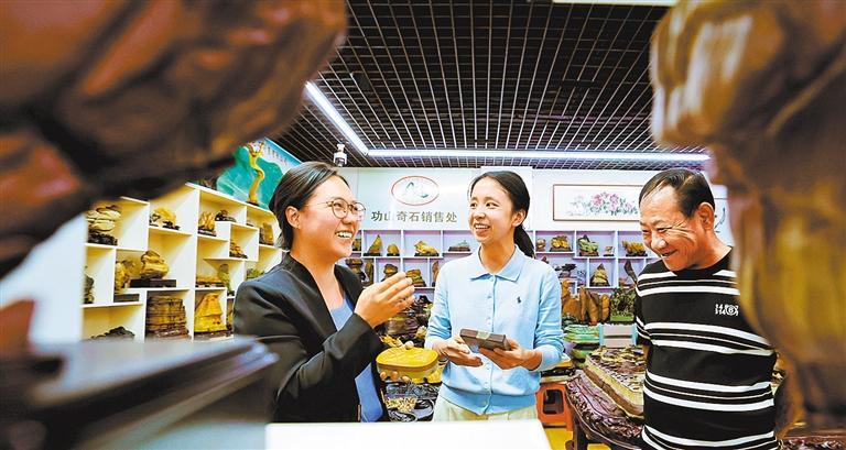 9月9日,位于白山市江源区的松花石博物馆,顾客在选购松花石工艺品。目前当地研创松花石系列产品共8大类300余款,形成“观赏石+文化产品+旅游纪念”多元产业链。