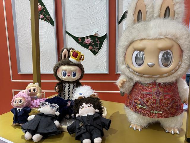 在开开集团展区,“三相映禧”三联盘扣画,将龙凤盘扣工艺嵌入家居装饰,让非遗见证百姓对平安、喜乐、自在的希冀。龙凤旗袍与亨生西服借“潮玩经济”之势,为 LABUBU 等知名潮玩定制专属高定娃衣,以年轻化路径推动非遗成为年轻人的“社交货币”。