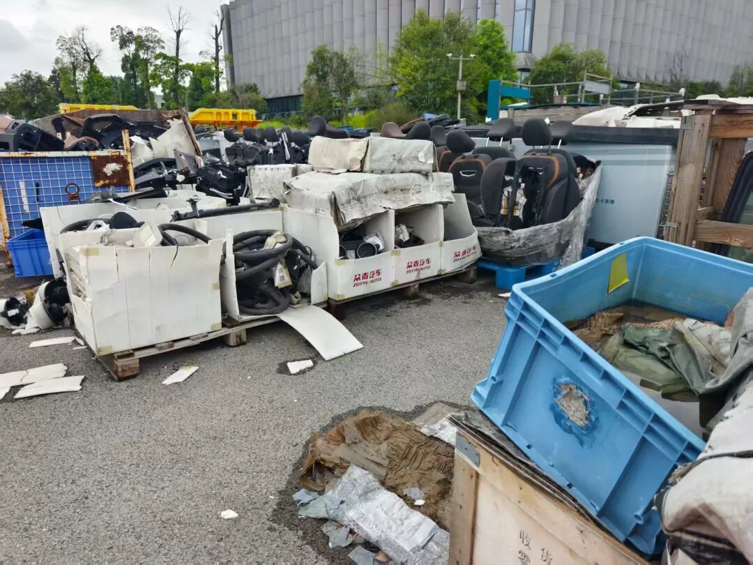 一块空地上,有些“板料托盘”上面盖着的防雨布已经破烂,但裸露在外的“后地板右纵梁”看起来非常新。另一块空地上,还没有来得及被安装的方向盘、座椅等物料被毫无遮拦地高高堆起。其中一堆一米多高的物料垛,则是包装整齐的“安全带预拉伸装置”,供货商是浙江松原汽车安全系统股份有限公司。由于在外风吹雨淋,这些纸箱已经被泡软了有些坍塌。另一垛“飞轮与齿圈组件”被放在一个木框里,木框的边缘已经有些开裂。
