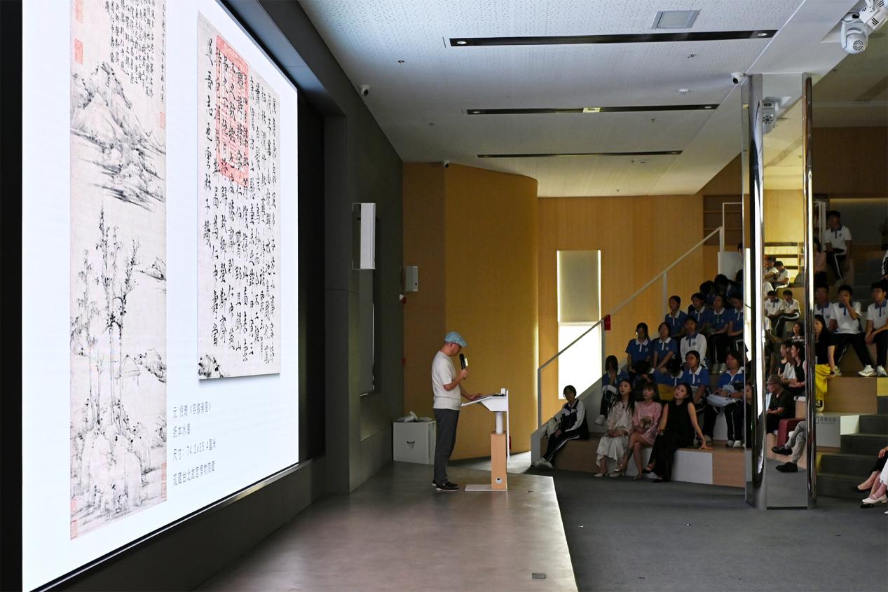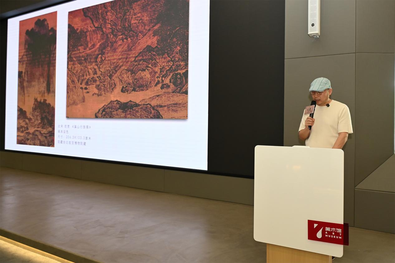 他以多幅经典名作为案例,讲解如何通过疏密、虚实、开合、呼应、宾主、藏露等传统构图法则,在有限画面中传递无限意蕴。从《溪山行旅图》高远构图的主次秩序与磅礴气象,《秋山红树图》中色彩与虚实营造的深远意境,到《容膝斋图》极简笔墨和空灵留白……构建“可行可望、可游可居”的心灵空间,为现场观众带来一场融贯古今的美学启迪。