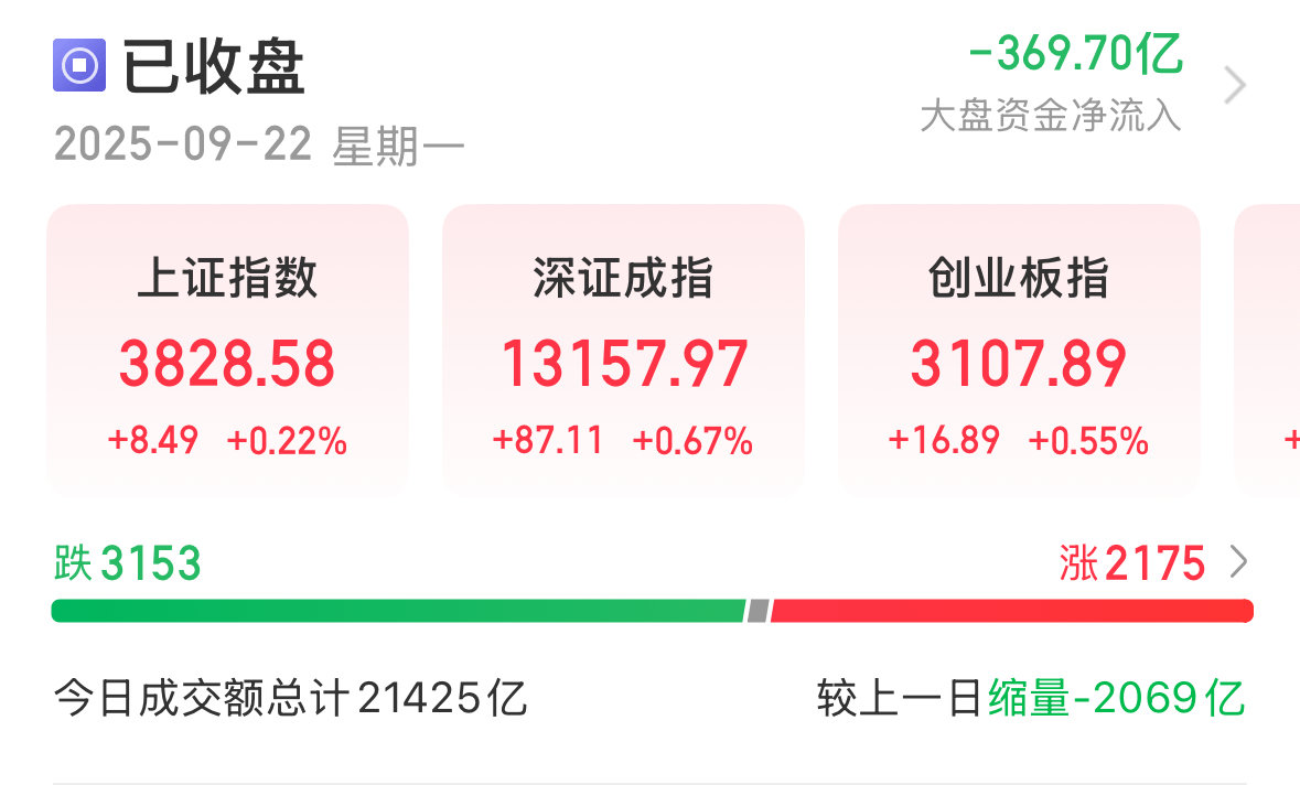 9月22日,A股三大指数集体上涨。截至收盘,上证指数涨0.22%,收报3828.58点;深成指涨0.67%,收报13157.97点;创业板指涨0.55%,收报310.7.89点。科创50今日强势上涨,涨幅达3.38%,收报1408.64点。全市场全天成交额21425亿元,较上日缩量2069亿元。全市场超2100只个股上涨。