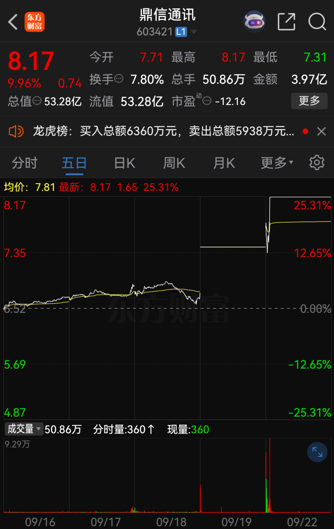 9月19日、9月22日,鼎信通讯连续两个交易日均涨停。截至9月22日收盘,鼎信通讯股价报8.17元/股,涨幅达9.96%,总市值为53.28亿元。
