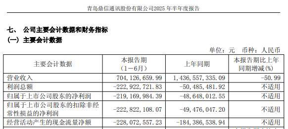2025年上半年,鼎信通讯的营业收入为7.04亿元,同比下降50.99%;归母净利润为-2.19亿元,而2024年上半年为-5048.55万元。