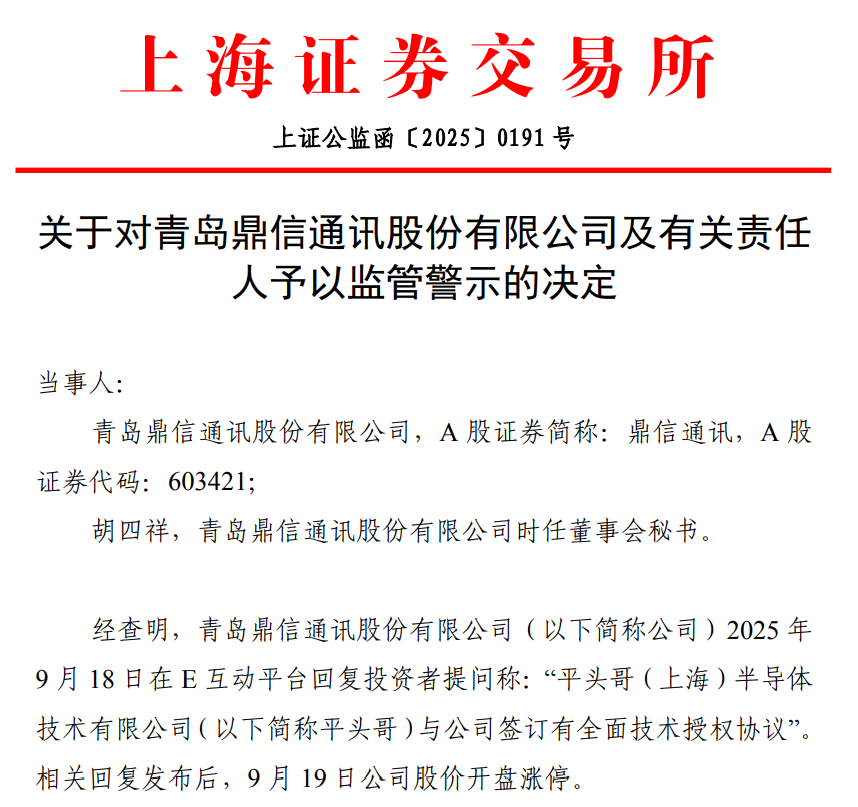 同日晚间,上交所发布《关于对青岛鼎信通讯股份有限公司及有关责任人予以监管警示的决定》,决定对鼎信通讯及其时任董事会秘书胡四祥予以监管警示。