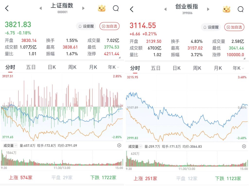 至收盘,上证综指跌0.18%,报3821.83点;科创50指数跌0.1%,报1407.3点;深证成指跌0.29%,报13119.82点;创业板指涨0.21%,报3114.55点。