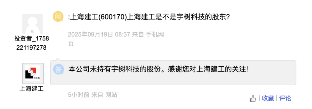 同日午间,上海建工集团股份有限公司(上海建工,600170.SH)在互动平台回应投资者时表示,公司未持有宇树科技的股份。