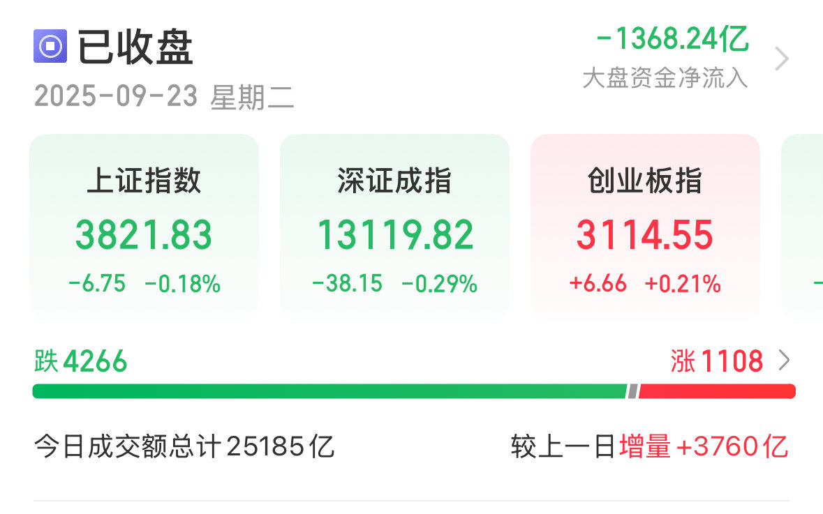 9月23日,A股三大指数涨跌不一。截至收盘,上证指数跌0.18%,收报3821.83点;深成指跌0.29%,收报13119.82点;创业板指涨0.21%,收报3114.55点。全市场全天成交额25185亿元,较上日放量3760亿元。下跌个股数量逾4200只,市场亏钱效应显著。从跌幅分布看,主要集中于0至3%区间,共3128只;跌幅在3%至5%的个股其次,为893只。