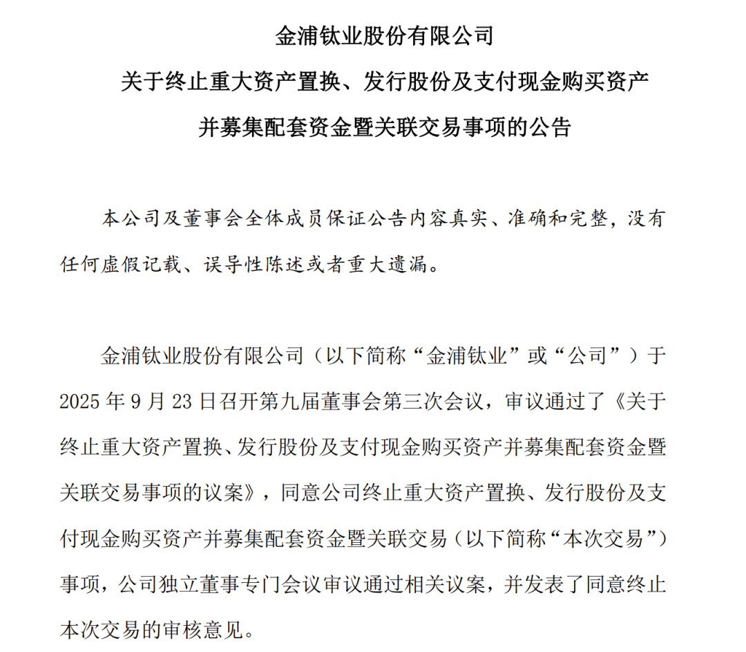 9月23日晚间,金浦钛业(证券代码:000545)发布公告称,公司于当日召开董事会会议,同意公司终止重大资产置换、发行股份及支付现金购买资产并募集配套资金暨关联交易事项。