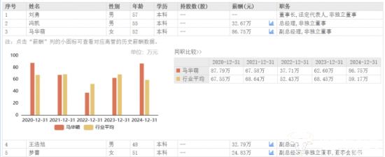 而在去年公司利润亏损的情况下,公司高管薪酬纷纷下降,马华萌的薪酬却不降反增。马华萌2024年薪酬为86.75万元,相较于2023年的62.60万元,上涨了24.15万元,是公司高管中唯一薪酬上涨的,连续两年为公司的最高薪酬,比总经理冯凯还高,也远超公司的另两位副总经理王浩旭和梦蕾。